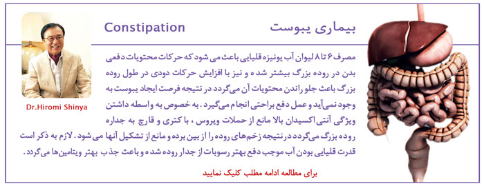 مصرف 8 تا 10 لیوان آب یونیزه قلیایی باعث می شو د که حرکات محتویات دفعی بدن در روده بزرگ بیشتر شده و نیز با افزایش حرکات دودی در طول روده بزرگ باعث جلو را ند ن محتویات آن می‌گردد در نتیجه فرصت ایجاد یبوست به وجود نمی‌آید و عمل دفع به راحتی ا نجام می‌گیرد . به خصوص به واسطه  داشتن  ویژگی آنتی اکسیدان بالا مانع از حملات ویروس ، با کتری و قارچ  به جداره روده بزرگ می‌گردد در نتیجه زخم‌ها ی روده را از بین برده و مانع از تشکیل آن‌ها می‌شود .لازم به ذکر است قدرت قلیایی بودن آب موجب دفع بهتر رسو با ت از جد ار روده شده و باعث جذب بهتر ویتامین‌ها می‌گردد .