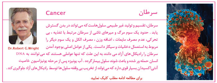 سرطان ، تقسیم و تولید غیر طبیعی سلول  هاست که می  تو اند در بدن گسترش یا بد . حدود یک سوم مرگ و میرهای ناشی از سرطان مرتبط با تغذیه ، بی تحرکی، عد م مصرف مایعات ، اضافه وزن ، مصرف ا لکل و یک سوم دیگر را مربوط به استعمال دخانیات و سیگا ر دانست . یکی از عوامل اصلی بوجود آمدن سرطان را رادیکال های آزاد می دانند به این علت که تنها عواملی هستند که   انسان حمله  ور شده و باعث شوند سلول بیمار گردد . آب یونیزه پس از مرحله  یونیزاسیون خاصیت  آنتی اکسید ان بسیا ر قوی دارد که می تواند از تخریب بی وقفه سلول ها توسط  رادیکال های آزاد جلوگیری کند.مرحله شروع : شامل تغییر شکل سلولهای تولید شده در اثر واکنش مواد شیمیایی رادیوتراپی یا ویروس ها با DNA سلولی می باشد.