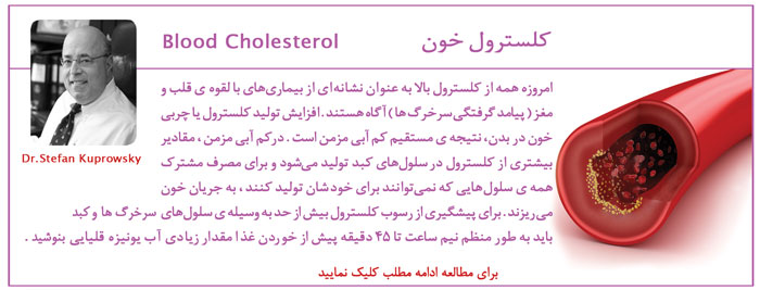 امروزه همه از کلسترول بالا به عنو ان نشا نه ای از بیماری های با لقو ه ی قلب و مغز ( پیا مد گرفتگی سرخرگ ها ) آگاه هستند . افزایش تولید کلسترول یا چربی خون در بد ن، نتیجه ی مستقیم کم آبی مزمن ا ست . در کم آ بی مزمن ، مقا دیر بیشتری از کلسترول در سلول های کبد تولید می شود و برای مصرف مشترک همه ی سلول هایی که نمی توانند برای خودشان تولید کنند ، به جریان خون می ریزند . برای پیشگیری از رسوب کلسترول بیش از حد به وسیله ی سلول های سرخرگ ها و کبد باید به طو ر منظم نیم ساعت تا 45 دقیقه پیش از خوردن غذا مقدار زیا دی آب یونیزه قلیایی بنوشید .