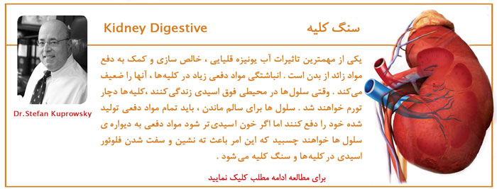 سنگ کليه در نتيجه تجمع ذراتي که از بدن دفع نشده اند ايجاد مي شود. سنگ هاي ريز از کليه ها دفع ميشوند ولي سنگ هاي بزرگتر به راحتي دفع نشده و حرکت آنها در کليه سبب دردهاي بسيار شديدي ميشود.یکی از مهمترین تاثیرات آب یونیزه قلیایی، خالص سازی و کمک به دفع مواد زائد از بدن است. انباشتگی مواد دفعی زیاد در کلیه ها، آنها را ضعیف می کنند .وقتی سلول ها در محیطی فوق اسیدی زندگی کنند،کلیه ها دچار تورم خواهند شد.